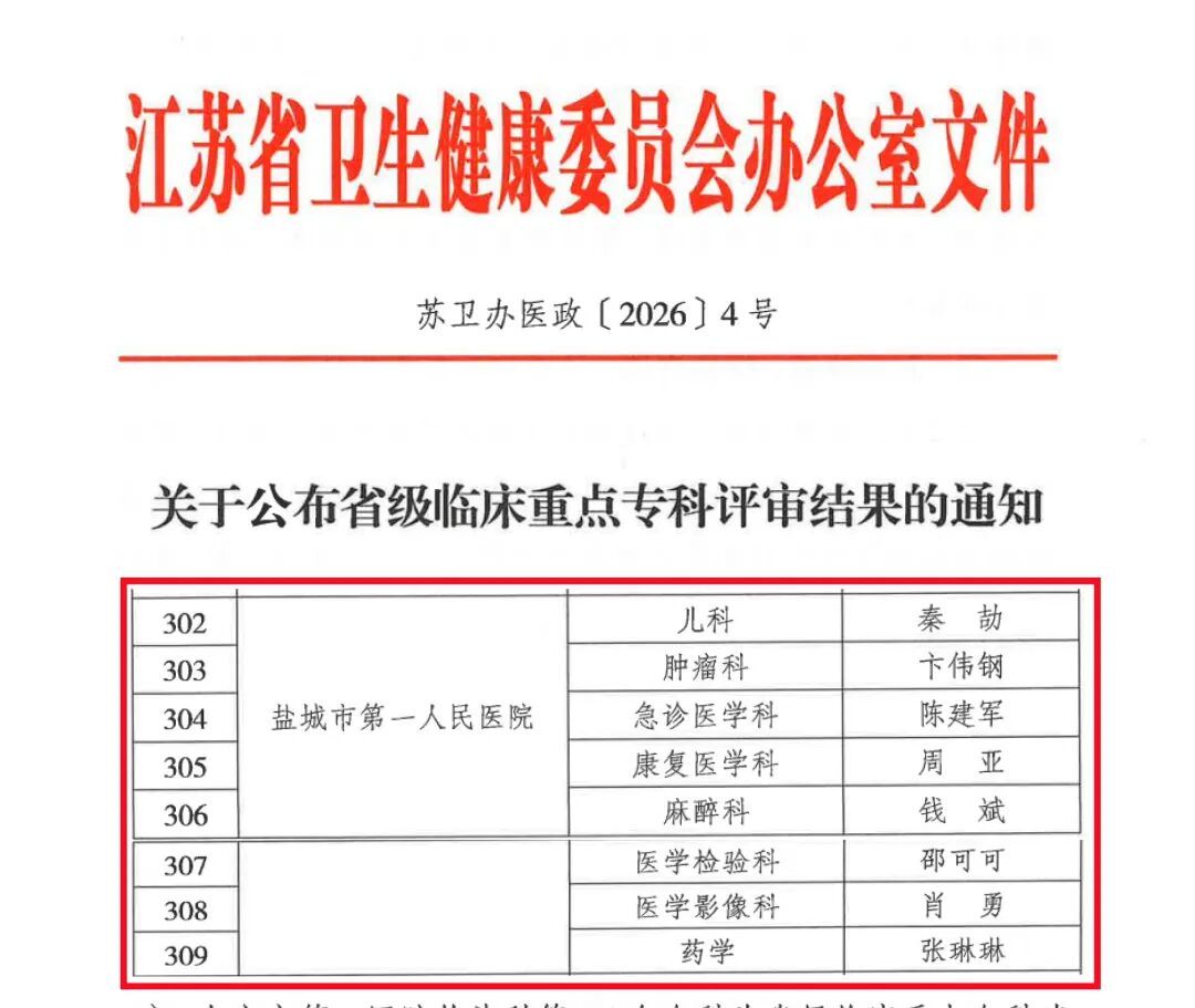 省级临床重点专科是衡量医疗机构专科能力与水平的核心标杆。此次评审覆盖全省各级医疗机构,竞争激烈、标准严苛。盐城市一院儿科、急诊医学科、康复医学科、药学同步上榜,既是省级卫生健康主管部门对医院专科建设工作的高度肯定,也为医院“十五五”新征程注入强劲动能,更为盐阜百姓享受更高水平诊疗服务筑牢坚实保障。