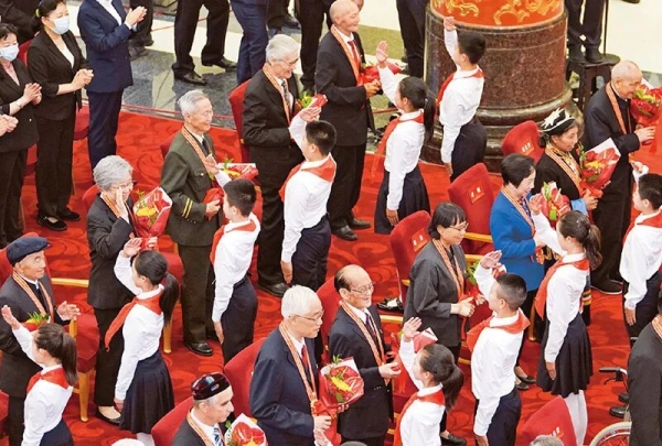 100多年来,一代又一代中国共产党人,为赢得民族独立和人民解放、实现国家富强和人民幸福,前仆后继、浴血奋战,艰苦奋斗、无私奉献。在他们身上,生动体现了中国共产党人坚定信念、践行宗旨、拼搏奉献、廉洁奉公的高尚品质和崇高精神。图为2021年6月29日,庆祝中国共产党成立100周年“七一勋章”颁授仪式上,少先队员向勋章获得者献花,敬礼致意。 新华社记者 高洁 摄